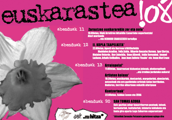 Aurtengo abenduan ere euskerak badu bere astea Putzuzulo Amets fabrikan…….. badator EUSKARASTEA. Aurreko urteko esperientziarekin eta gogotsu gatoz berriz ere Aek, Xakela gaztetxe asanblada eta Urola kostako hitza elkarlanean euskararen inguruko astea antolatuz. II.Euskaraste honetan hitzaldi, kontzertu, artixten kolax, kopla txapelketa eta mila gauzaz gozatu ahalko dugu. hona hemen egitaraua. Bertan ikusiko garelakoan eskertuko genuke mezua ahalik eta jende gehienari iristen lagunduko bazenigute!! ON EGIN!!!