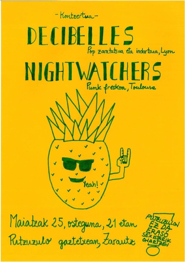 Lyindik Decibelles taldea etorriko da, Pop zaratatsua egiten. Frantziako Tolosatik betriz, Nightwatchers laukotea gerturatuko da beraien Punk doinuekin. Kontzertua gaueko 21:00etan hasiko da.